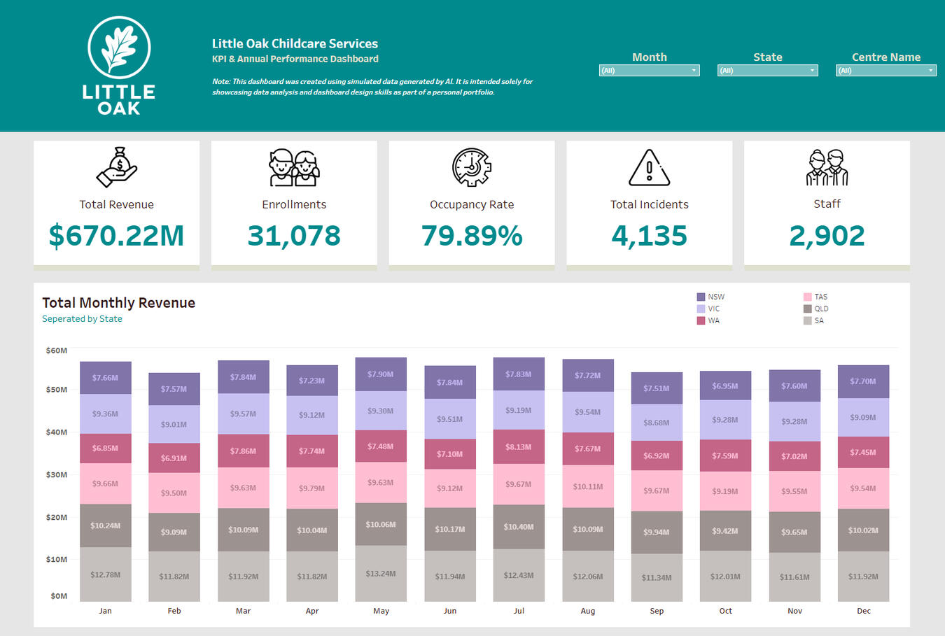 This dashboard was built using synthetic AI-generated data from a fictional daycare, Little Oak. While the insights aren’t real, it showcases my Tableau skills -- including interactivity, design clarity, and effective use of tooltips to communicate key information.