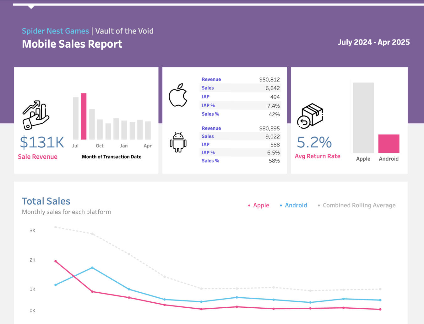 An interactive Tableau dashboard designed to track and forecast mobile sales trends for Vault of the Void. It includes platform comparisons, region-specific insights, revenue breakdowns, and trend forecasting.