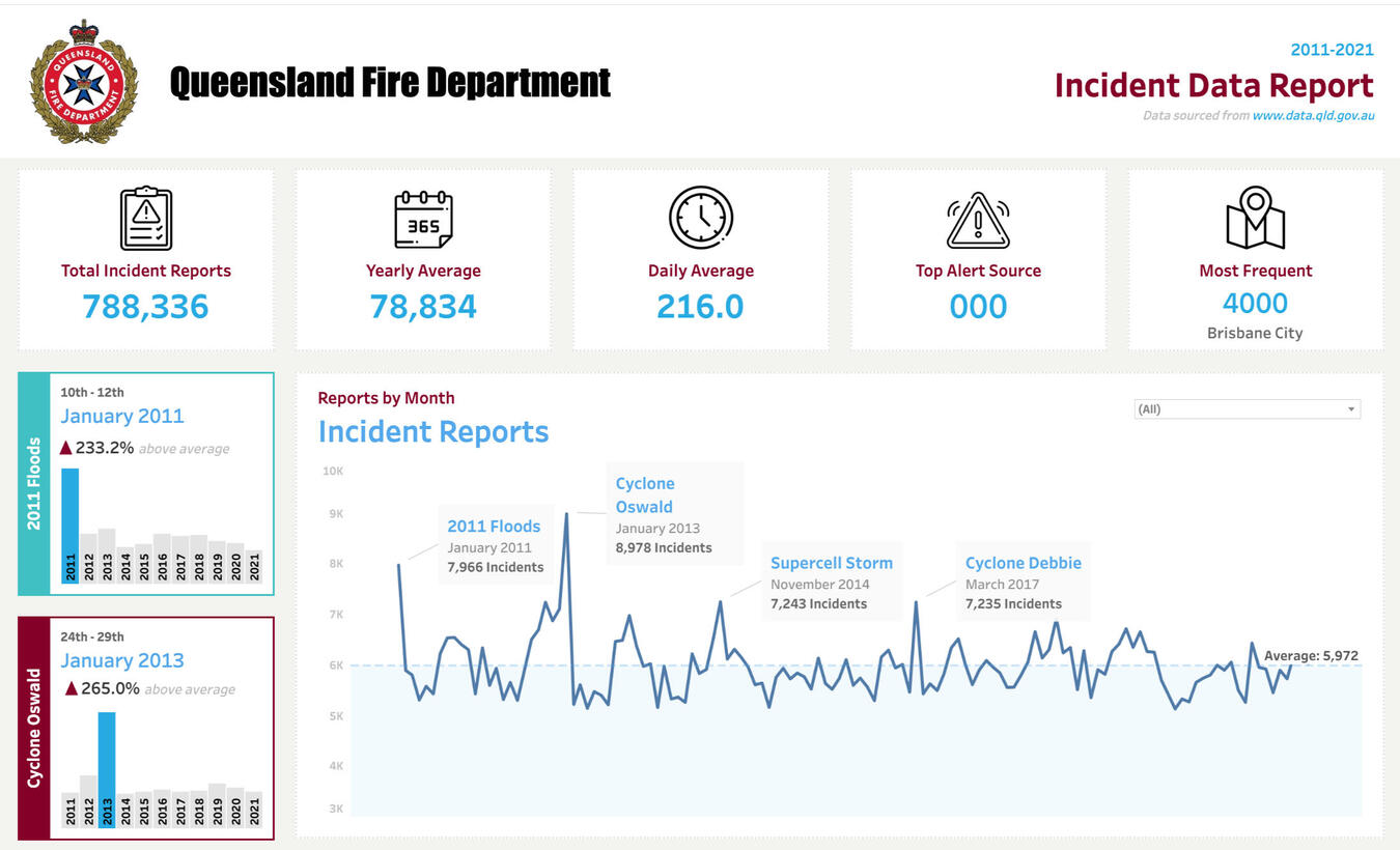 This dashboard was created as part of a personal project to explore Queensland Fire and Emergency Services (QFES) incident data. The goal was to identify meaningful patterns, highlight key operational metrics, and demonstrate how visual analytics can support emergency response planning and performance tracking.Data was sourced from QLD Fire’s open datasets and processed using PostgreSQL, Python, and Tableau. It includes suburb-level analysis, incident volume over time, resource deployment patterns, and callout types. One of the standout findings was the dramatic increase in service demand during natural disasters, which aligned with historical events like Cyclone Oswald.This project was built independently to showcase my interest in the data analyst role with QFES.