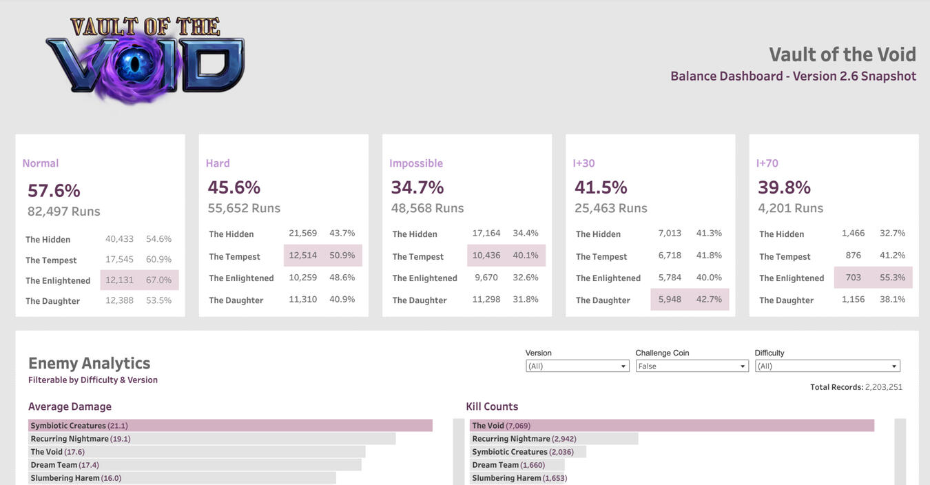 An in-depth breakdown of how player data is used to balance Vault of the Void. This article covers data cleaning, Tableau Prep workflows, class and card performance analysis, and encounter difficulty tuning.